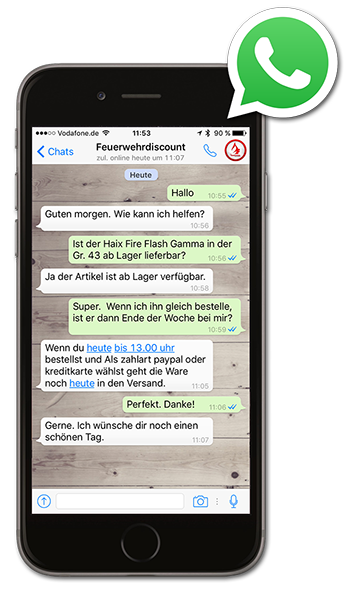 Sie erreichen uns per WhatsApp zu unseren Geschäftszeiten. Nachrichten die außerhalb dieser Zeiten an uns gesendet werden, beantworten wir schnellstmöglich sobald wir wieder verfügbar sind. Beim Kontakt via WhatsApp können Kosten durch die Nutzung des Internets entstehen, die abhängig von ihrem persönlichen Netzanbieter sind.